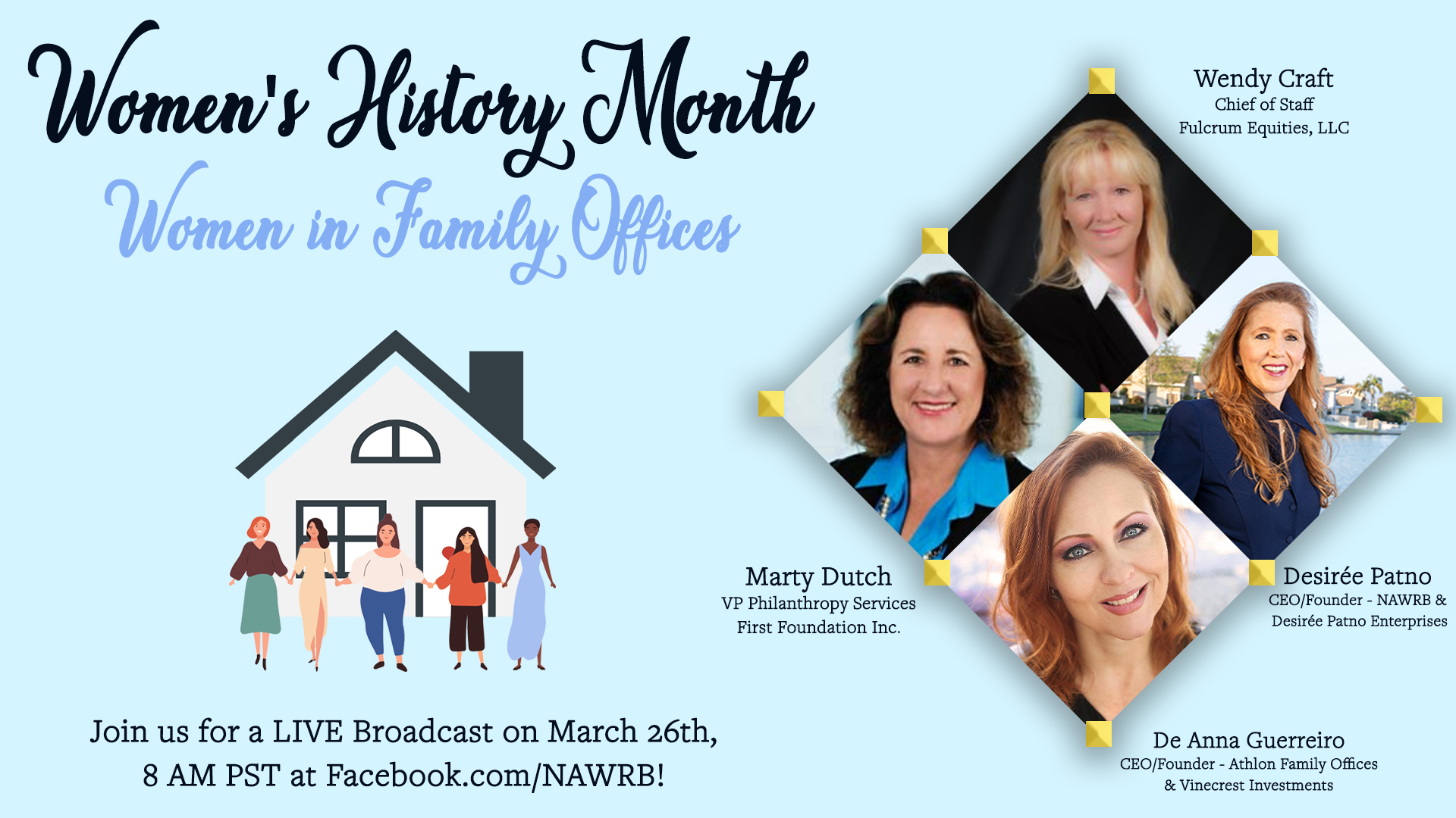 To continue our celebration of Women’s History Month, join us LIVE this Friday, March 26th at 8 AM PST in a roundtable discussion on Women in Family Offices with Powerhouses: Desirée Patno, CEO and Founder of NAWRB; Wendy Craft, Chief of Staff, Fulcrum Equities LLC; Marty Dutch, VP and Director of Philanthropy Services First Foundation Inc.; and De Anna Guerreiro, Founder and Managing Partner at Athlon Family Office and Vinecrest Investments