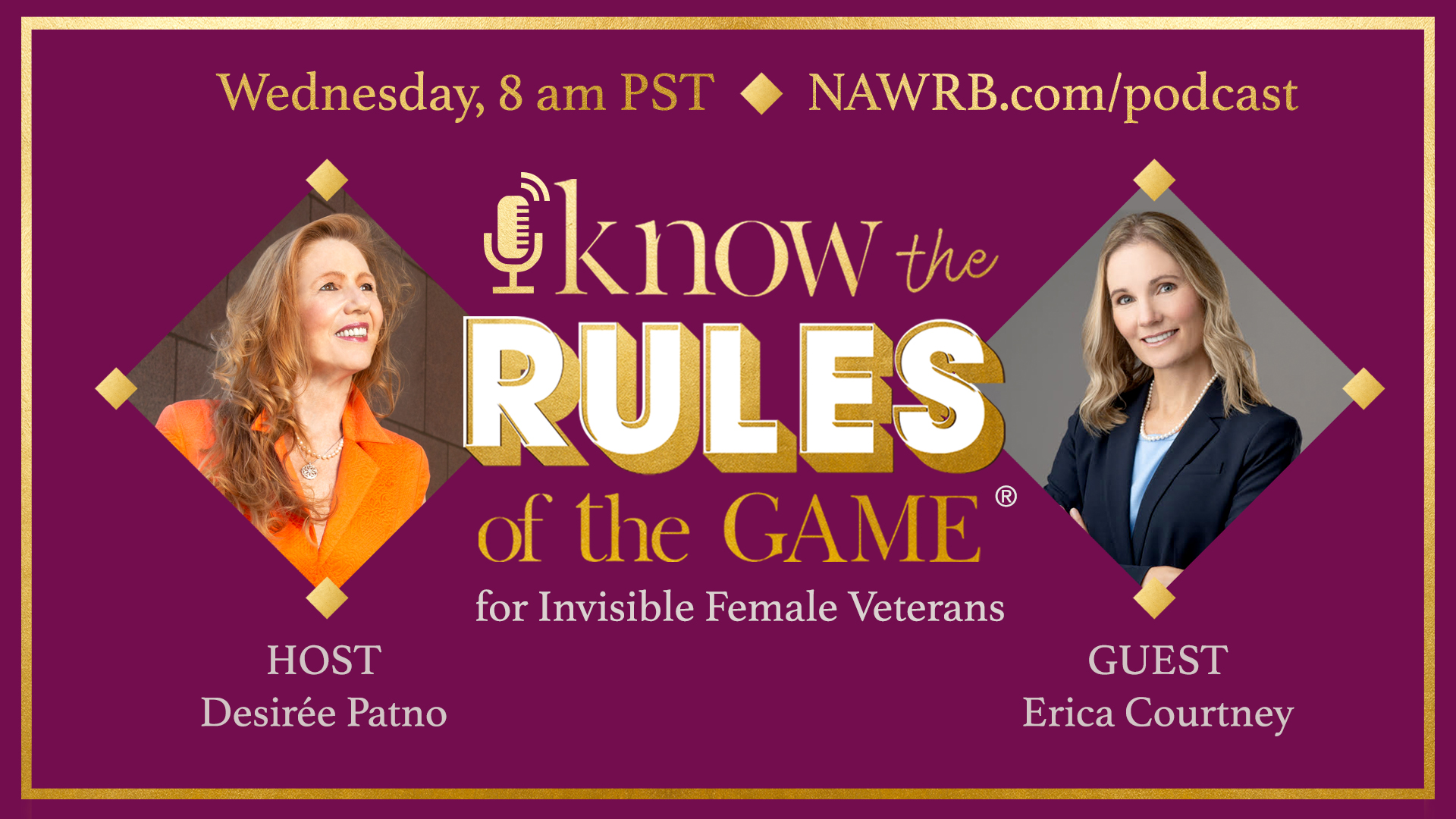 Listen now for an all new episode of the Know the Rules of the GameⓇ podcast about Invisible Female Veterans with your host Desiree Patno, CEO & President of NAWRB, and special guest Erica Courtney, President, Zulu Time, Founder, 2020vet, Inc., U.S. Army Aviation, Major NATO Gender Advisor. Listen here: https://www.nawrb.com/podcast/ or listen on YouTube here!